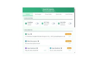 콘텐츠 및 SEO 분석 외에도 Visual SEO Inspector는 단어 및 문자 수, 읽기 시간 추정치 및 n-그램 빈도 분석을 포함한 자세한 텍스트 분석을 제공합니다. Phrase Finder 기능을 통해 사용자는 사용자 정의 구문을 효과적으로 관리할 수 있습니다. 쉬운 탐색을 위한 탭 인터페이스를 통해 사용자는 브라우저에서 직접 필수 SEO 도구 및 Google Search Console 데이터에 액세스할 수 있어 SEO 준수 및 소셜 미디어 최적화를 위한 감사 프로세스를 간소화합니다.